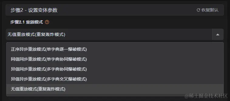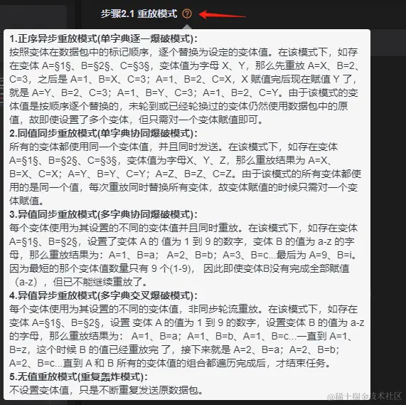 解释:选择无值重放模式,该模式不需要设置其他任何参数,只对请求的数据包进行重复发送,更多的模式可以点击“重放模式”后面的“问号图标”进行查看: