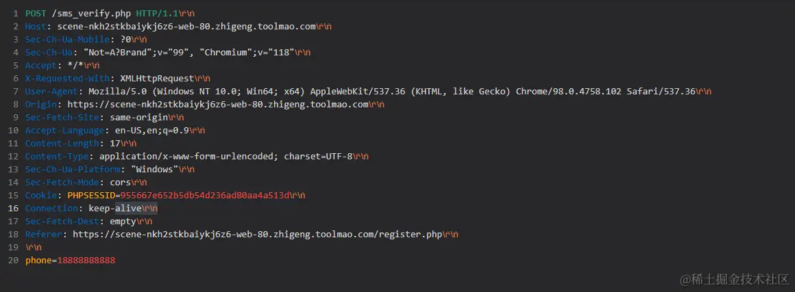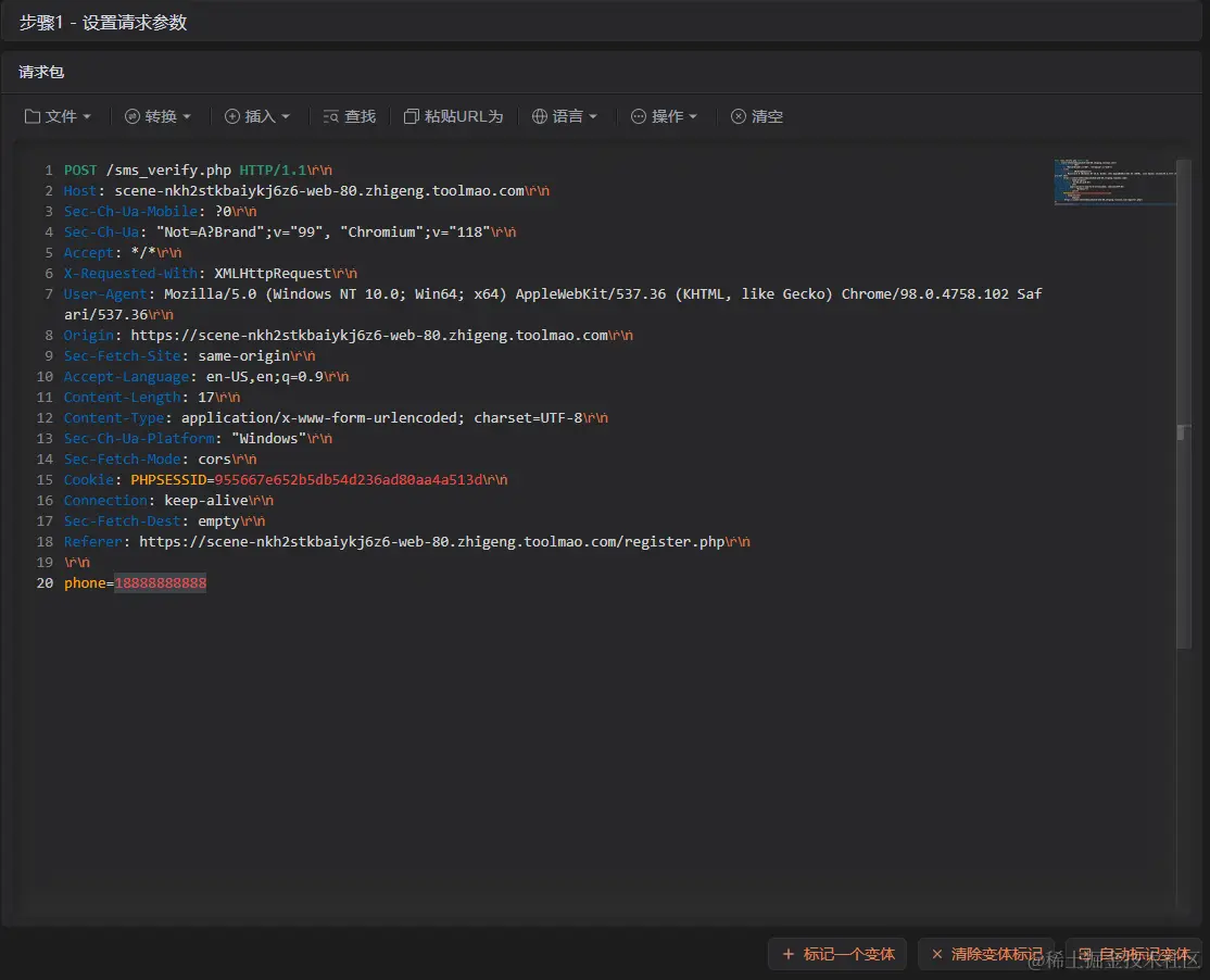重复点击发送按钮,发现会一直发送请求短信校验码的数据包,并且都得到了相同的返回结果,很有可能是短时间大量点击造成的张老板所说情况,但是手动点击耗时耗力,所以这里使用 HTTP模糊测试工具来解决这个问题,发送到 HTTP模糊测试工具中。