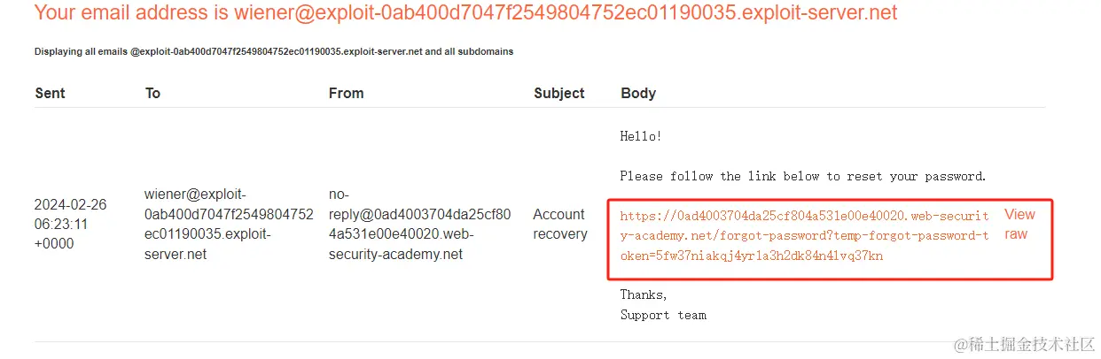 修改密码需要填写认证邮箱,填写(wiener)的邮箱(wiener@**exploit-server.net):