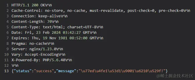 发送到数据重发页面,点击发送按钮,可以看到右侧返回数据中显示成功发送数据,返回了 HTTP 为 200 的响应码,并且内容为: