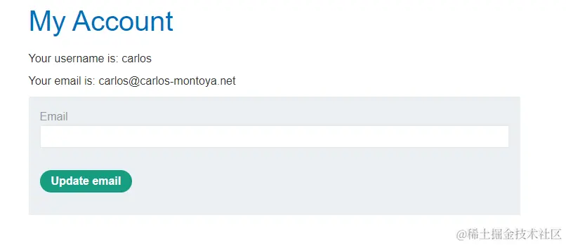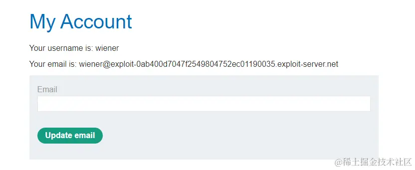 使用提供的账号(wiener)登录进来,跳转到后台界面,该界面是一个邮箱更新的界面,并没有修改密码界面: