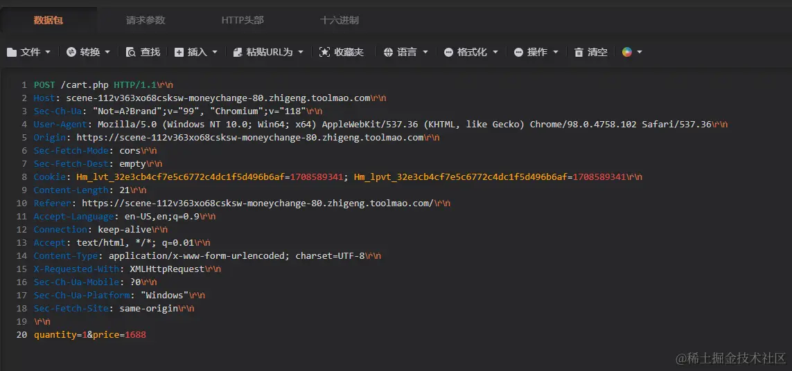 该数据为一个 POST 类型的请求数据包,最后的一行包含了此次请求的发送的数据,"quantity=1&price=1688"中文含义理解为“数量=1&价格=1688”,可以得出此次请求中,提交了一个数据,其中表明购买的数量为 1,物品的价格为 1688 。