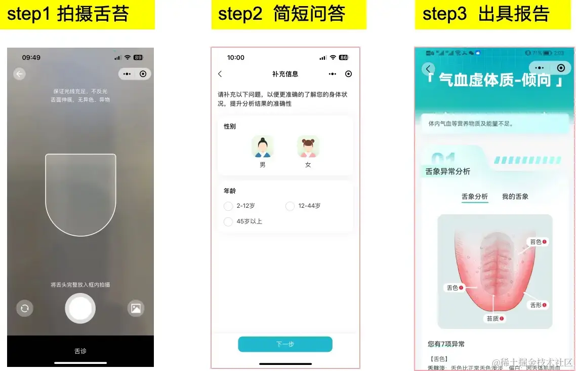 只需三步即可生成中医体质报告:用户拍摄自己的舌部、面部照片,上传后系统立刻检测,给出分析报告,检测有效率可以达到90%以上。