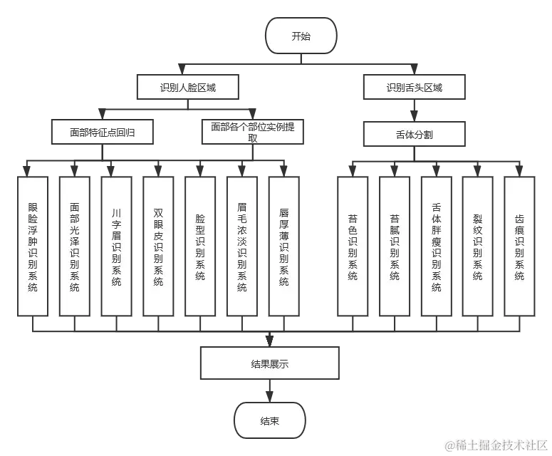 首先,通过目标检测算法识别人脸和舌头区域,获得人脸区域和舌头区域的外接矩形框;然后,对获得的人脸区域和舌头区域进行具体部位的提取。系统识别到人脸区域进行特征点回归的操作获得人脸的特征点信息,同时对人脸区域进行实例分割获得眉毛、眼睛、鼻子、嘴唇、皮肤、头发、耳朵、口、脖子等,系统对识别到的舌体区域进行舌体分割,获得没有背景干扰的舌体,提高舌诊的精度,用于后续的舌诊计算机识别;然后,系统根据提取到的实例图片和面部特征点等多种信息对舌面特征进行预测;最后,可视化预测结果。