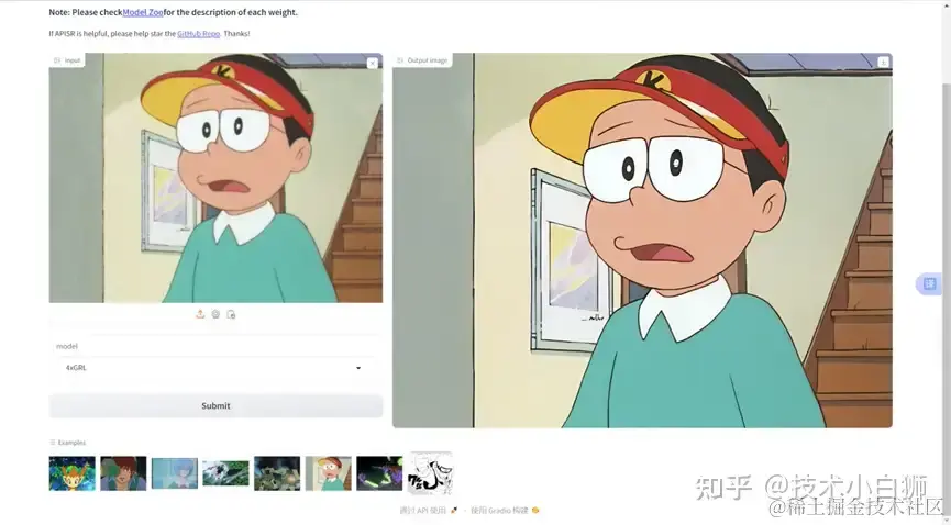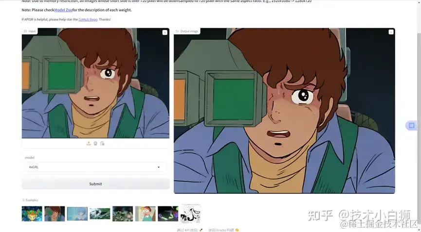 页面跳转后,在 input 上传需要增强画质的图像后,点击 Submit,即可完成画质增强,生成清晰的图像。