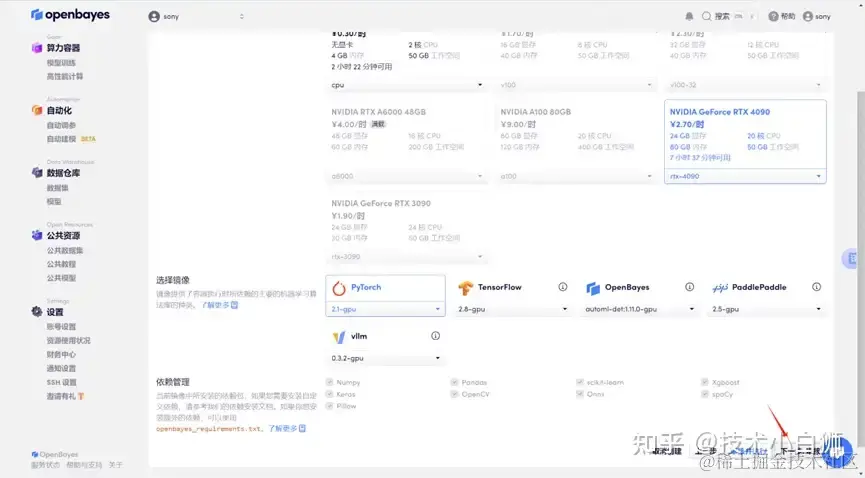 跳转到算力选择界面后,选择 RTX 4090 的算力以及 PyTorch 的镜像,点击「下一步:审核」。