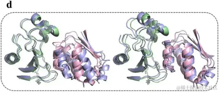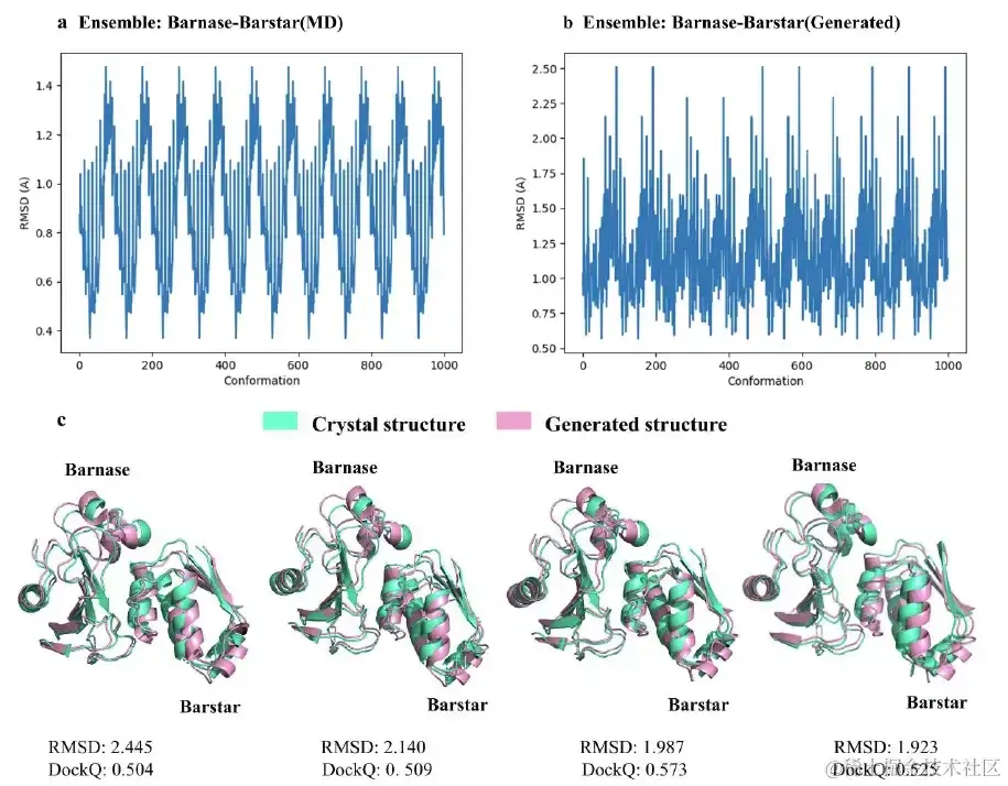 该研究还从 AlphaPPImd 模型生成的 1,000 个 barnase-barstar 复合物构象中,选择了 4 个 RMSD 接近 2Å 的代表性构象。研究结果表明,AlphaPPImd 生成的蛋白质复合物构象模型与参考晶体结构更接近, 准确度更高(均方根偏差 < 2Å)且可接受性更高(DockQ ≥ 0.23)。