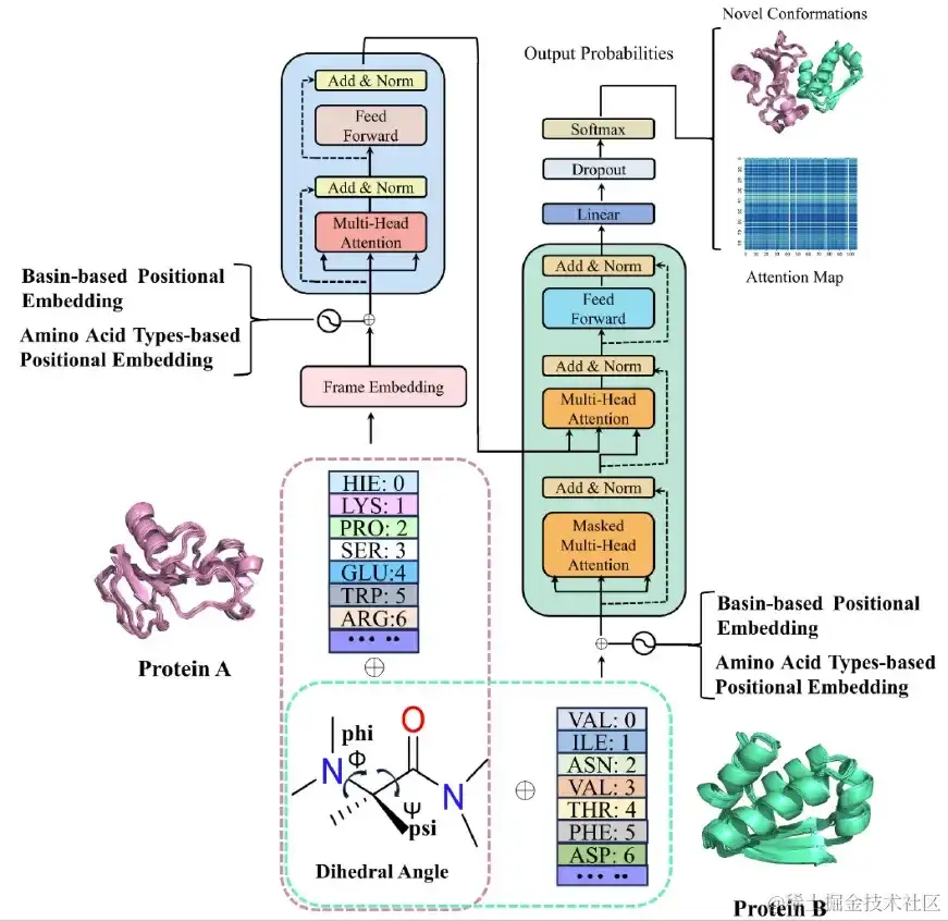在完成分子动力学模拟后,研究团队基于 Transformer 构建了 AlphaPPIMd 模型,利用深度生成模型来捕捉传统分子动力学难以分析的蛋白质构象状态。 AlphaPPImd 框架的核心是自注意力机制,可以从 MD 轨迹中捕获影响蛋白-蛋白复合物构象的关键氨基酸残基对。