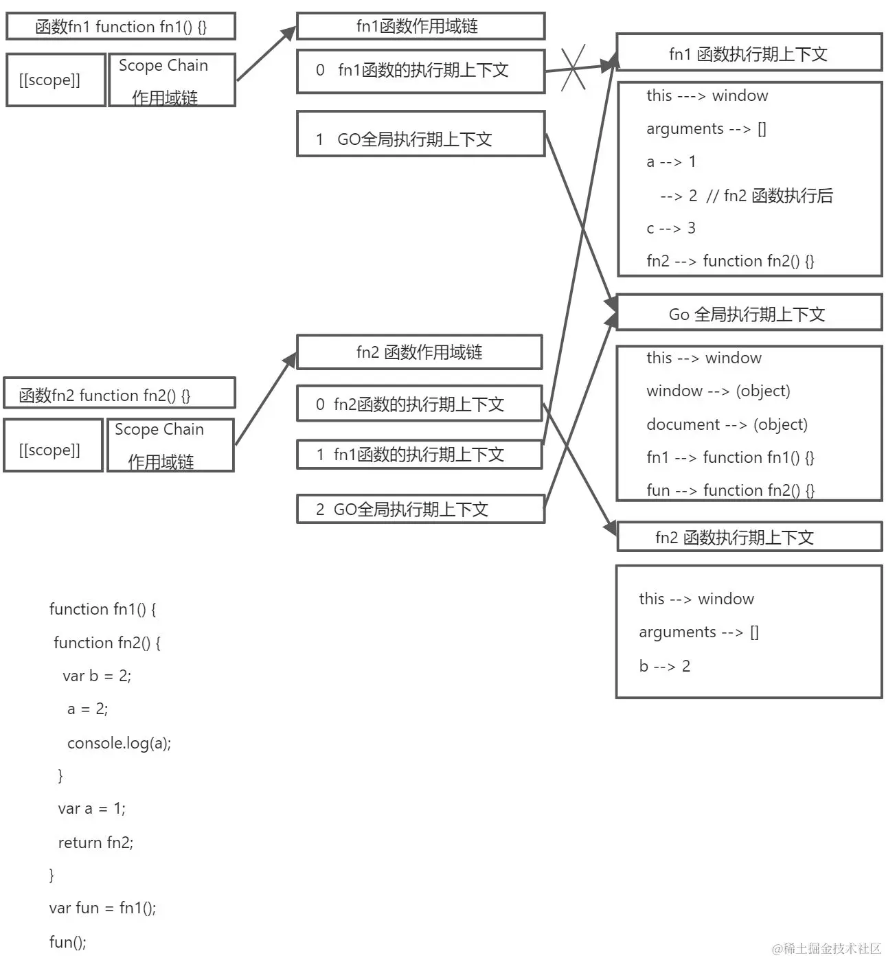 当fn1函数执行完成后,本应该销毁fn1函数的执行期上下文,fn1函数回到fn1函数声明被定义的时候作用域环境。但是由于fn2函数的作用域链也在引用着fn1的函数执行期上下文,所以导致fn1函数执行期上下文在堆内存中无法销毁,一直保留下来(因为return发挥了闭包的特性,return将整个闭包函数fn2(fn1AO环境+fn2AO环境)返回到全局作用域中,导致fn1的AO环境并没有执行后销毁)。从而在全局环境下调用fun变量相当于调用fn2函数,此时根据fn2函数作用域链的查找顺序,仍然能获取fn1函数的执行期上下文,从而找到a变量 a = 2;