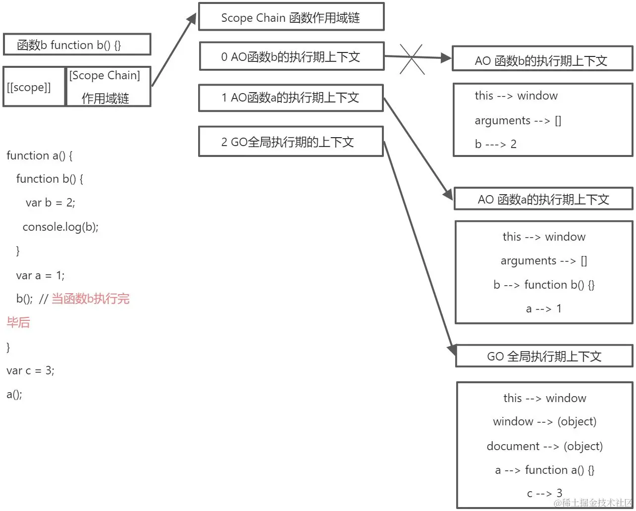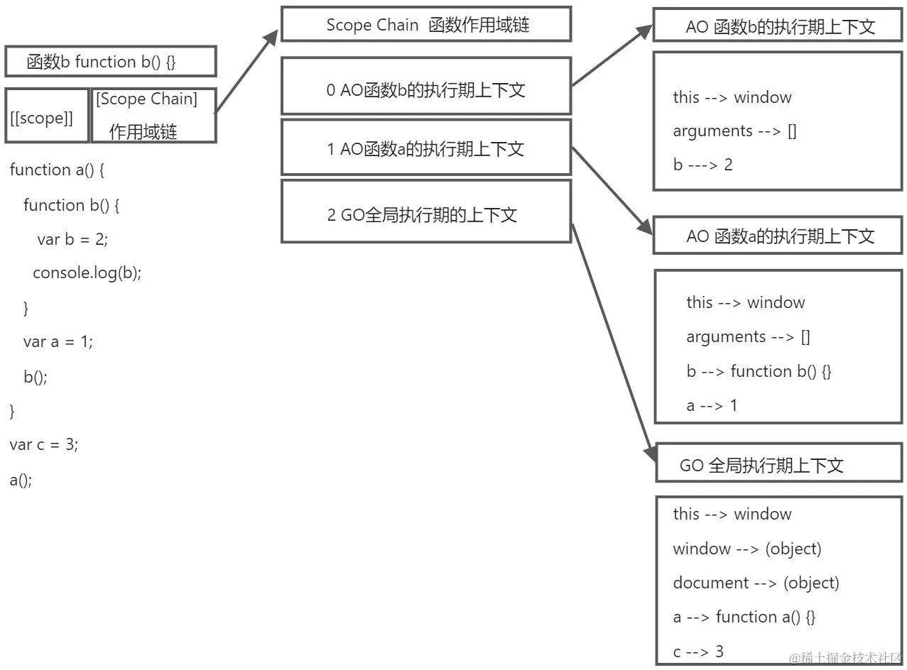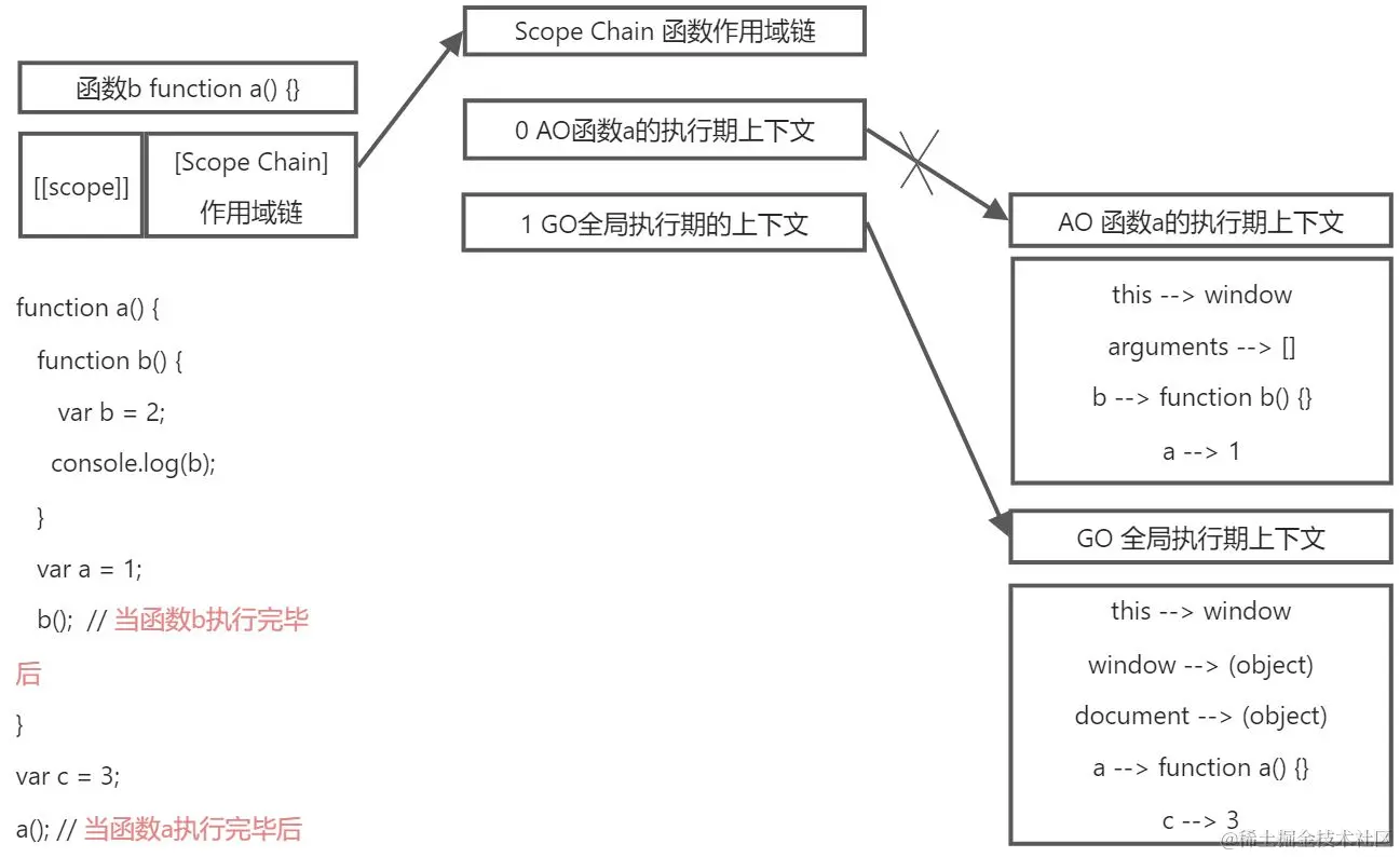 当b函数被执行的前一刻时,作用域链顶端的(第0)位储存b函数生成的函数执行期上下文AO,同时第1位储存a函数生成的函数执行期上下文AO,第2位储存GO。查找变量是到b函数储存作用域中从顶端开始依此向下查找。