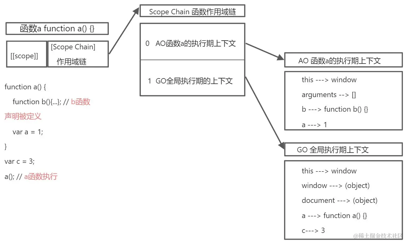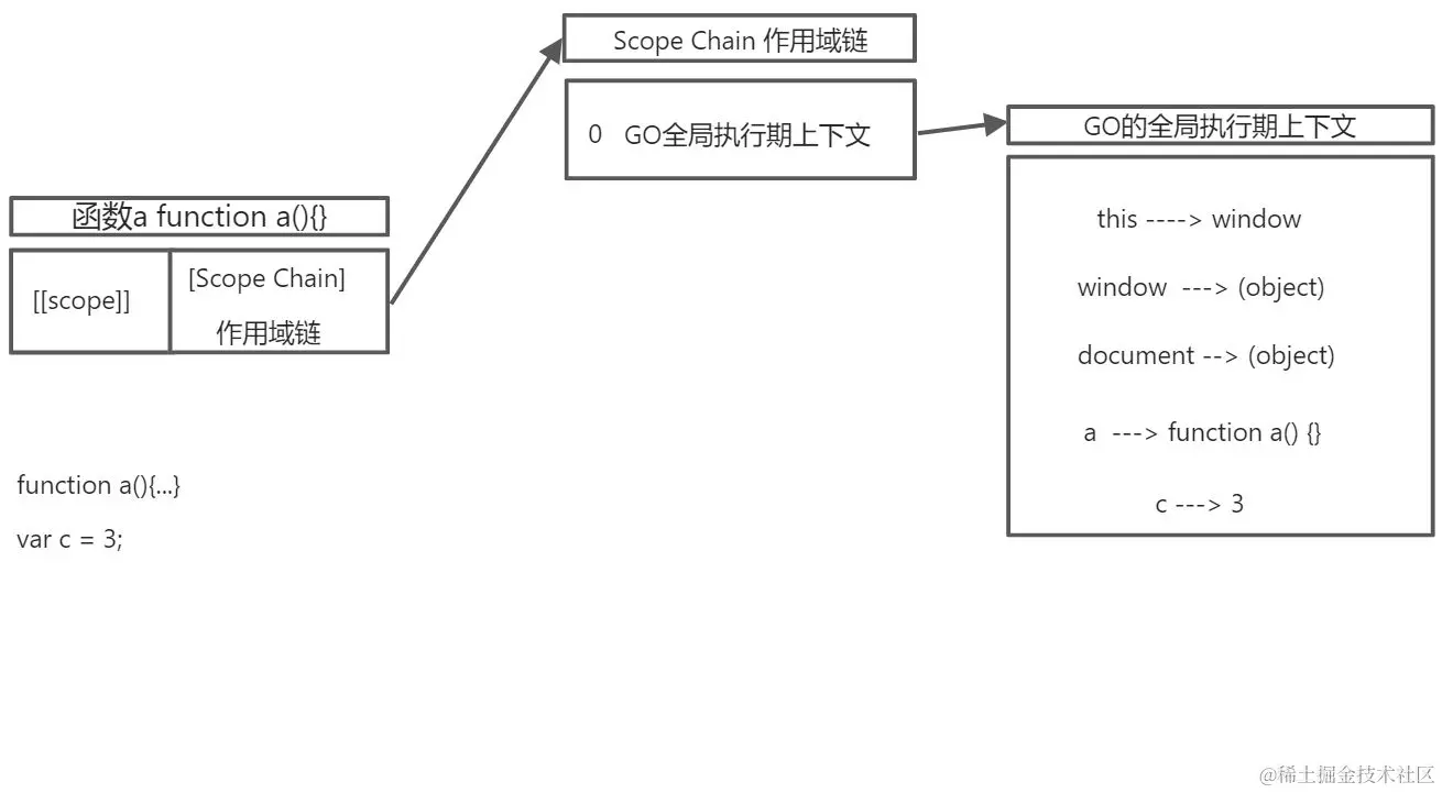在a函数被定义时,系统自动生成[[scope]]属性,[[scope]]属性保存着该函数的作用域链[Scope Chain], 该作用域链的第0位储存着当前环境下的全局执行期上下文GO,GO里存储全局下的所有对象,其中包括函数a和变量c