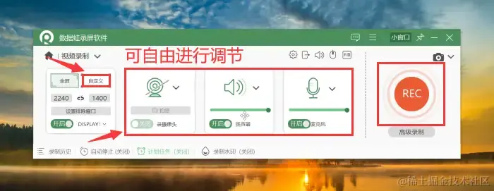 步骤3:进入视频录制后,您可自由选择录制的范围,同时可对声音选项、摄像头等进行调节。调节完毕后点击 【REC】 按钮进行录制。
