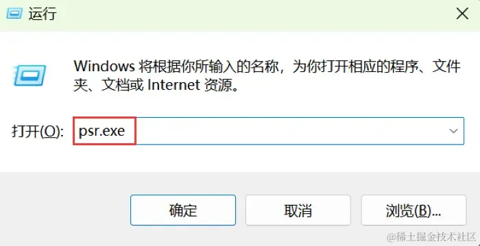 步骤2:在页面的输入框中输入 【psr.exe】 ,直接点击 【确认】 即可进行录制。