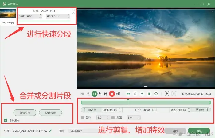 步骤4:录制完成之后,你可以在预览视频或历史录制中进入 【高级剪辑】 页面。可以对您的视频进行剪辑,增加特效等,还可以对视频进行快速分段或者合并。