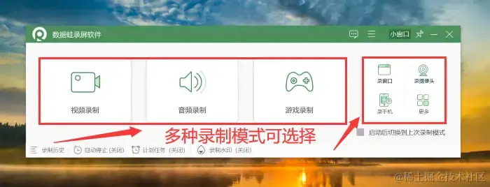 步骤2:安装完成后,数据蛙录屏软件支持多种模式的录制,您可以根据您的需求选择合适的录制模式。