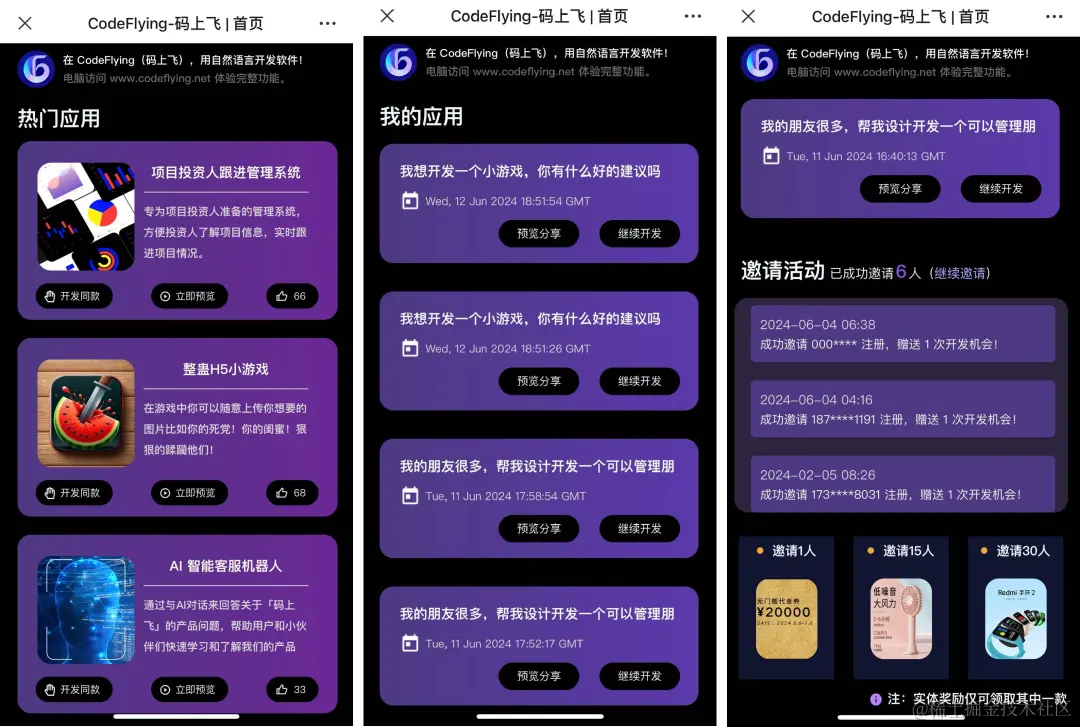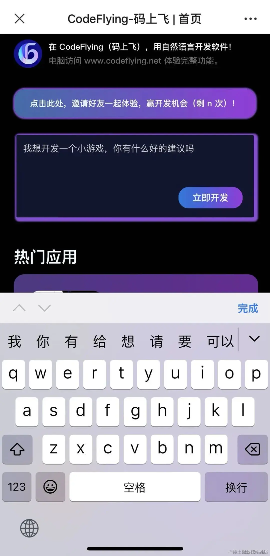 进入到CodeFlying中,不仅可以体验当前的热门应用,如果你喜欢的话还可以免费开发同款。除此之外,在首页中还能够查询到所有开发应用的历史记录,支持在对话中随时调整开发需求!