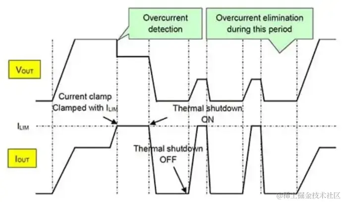 如果通过外部电阻器 (RLIM)设定的输出电流由于负载故障或者短路而超过电流限值(ILIM)时,则输出电流和输出电压下降,从而限制IC和负载的功耗。当输出电流达到预设限值并检测到过电流时,输出电流会被钳制,以使流经的电流不超过IIM。假如过电流问题在此阶段未解决,则会维持这种电流钳制状态且电子保险丝的温度继续升高。
