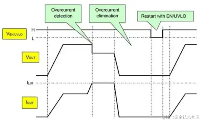 相反,闩锁模式会箝制输出,直到通过IC的使能(EN/UVLO)引脚使电子保险丝复位