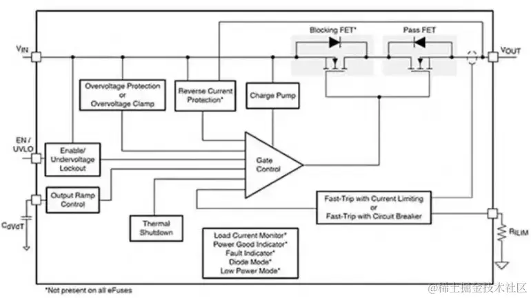 - 过压保护:借助一些额外的电路,eFuse还可以提供过压保护,以防止浪涌或感应跳闸即当输入电压超过设定的过压跳闸点时,切断FET并在过压条件持续期间保持在断开状态