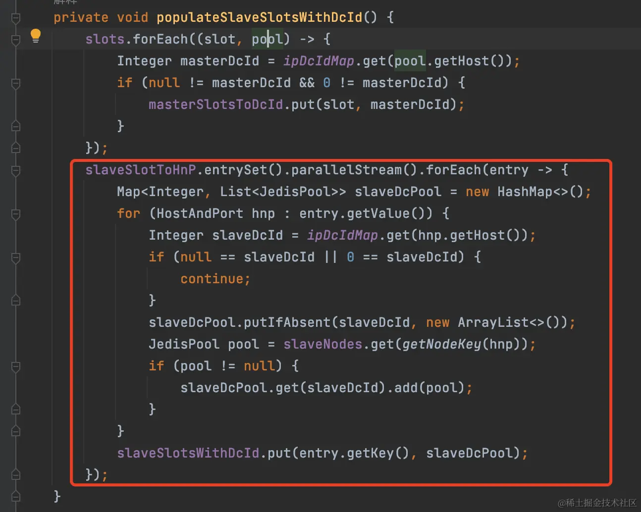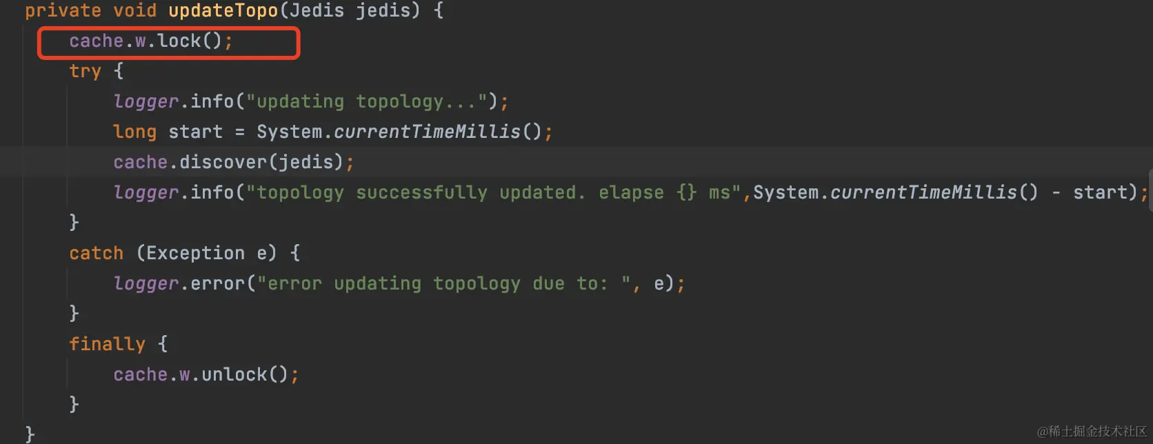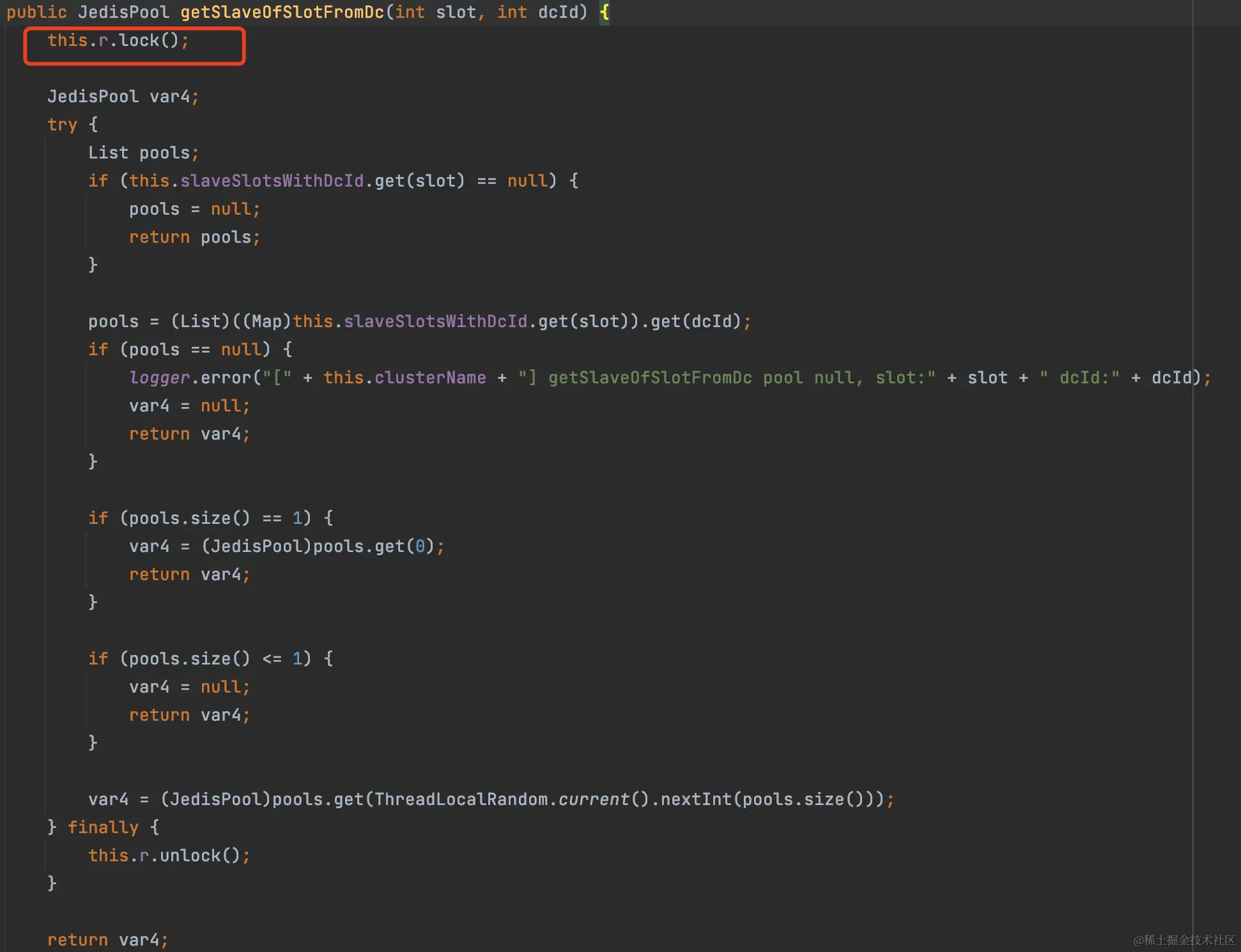 getSlaveOfSlotFromDc在方法入口就需要获取读锁,同时在全局变量声明了读锁和写锁: