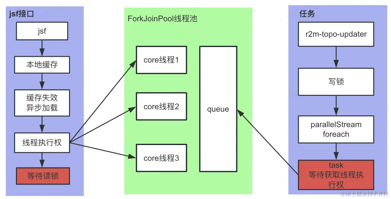 经过查找资料确认,如果没有指定,那么parallelStream().forEach会使用ForkJoinPool.commonPool这个默认的线程池去处理任务,该线程池默认设置(容器核心数-1)个活跃线程。同时caffeine数据过期后会异步刷新数据,如果没有指定线程池,它默认也会使用ForkJoinPool.commonPool()来执行异步线程。那么就有概率出现获取到写锁的线程无法获取执行权,获取执行权的线程无法获取到读锁。