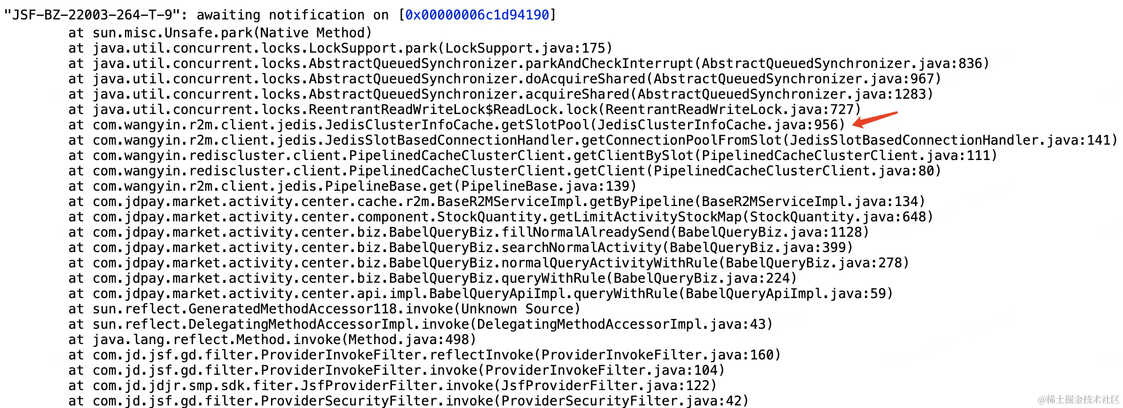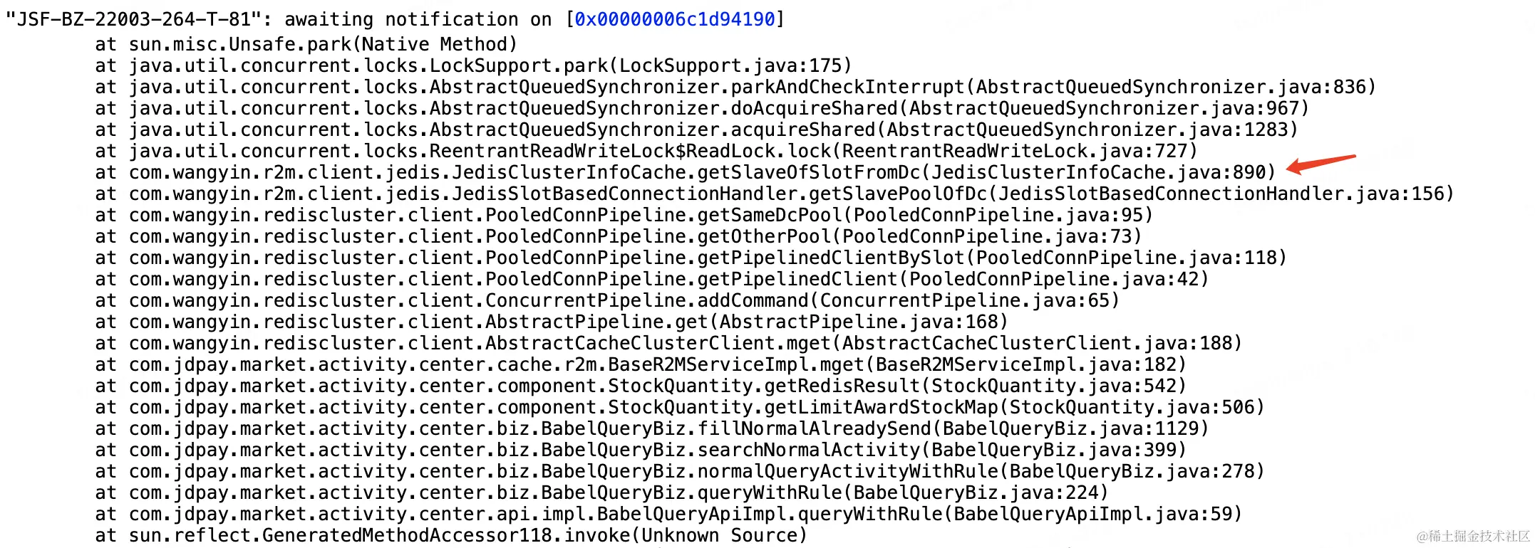 此时对问题有一个大体的了解,大概推测:getSlaveOfSlotFromDc是获取redis连接池,该方法入口处需要获取读锁,由于读锁之间不会互斥,所以猜测有业务获取到写锁后没有释放。同时读锁没有设置超时时间,所以导致杰夫线程处理业务时卡在获取读锁处,无法释放。