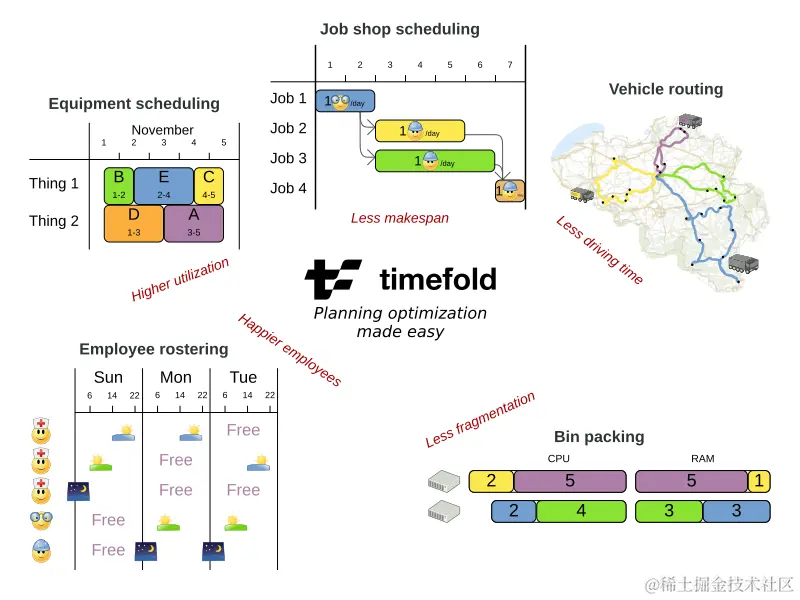 Timefold Solver是一个轻量级、可嵌入的约束满足引擎,可优化规划问题。它解决了以下用例: