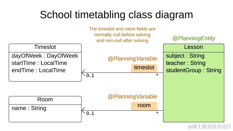 实现课程表编排,Lesson实例分配给Timeslot和Room实例以遵守硬调度和软调度