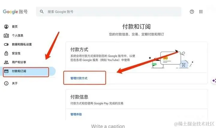 点击左边付款和订阅,然后点击管理付款方式,随后点击添加付款方式