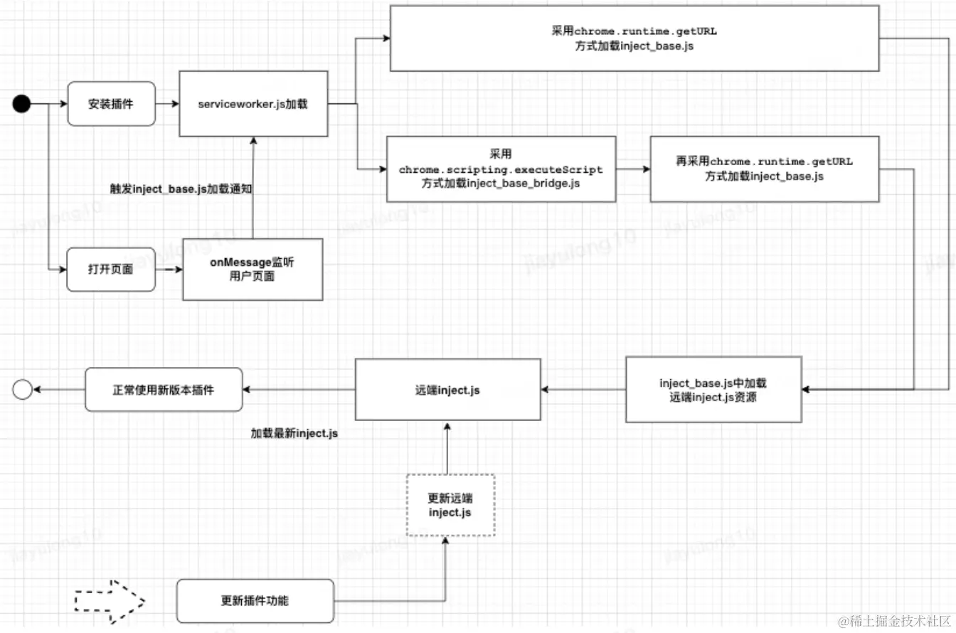 浏览器插件的新版均只允许加载本地资源,而限制外部资源的加载;本发明同样遵循浏览器内核要求,在serviceworker中加载插件中预制资源inject_base.js到页面里,需要直接或间接用chrome.runtime.getURL方法加载inject_base.js资源,然后再从inject_base.js中加载远端inject.js资源即可,此处两步过程可以扩展到三步或更多步骤,但不可省略这两个步骤。