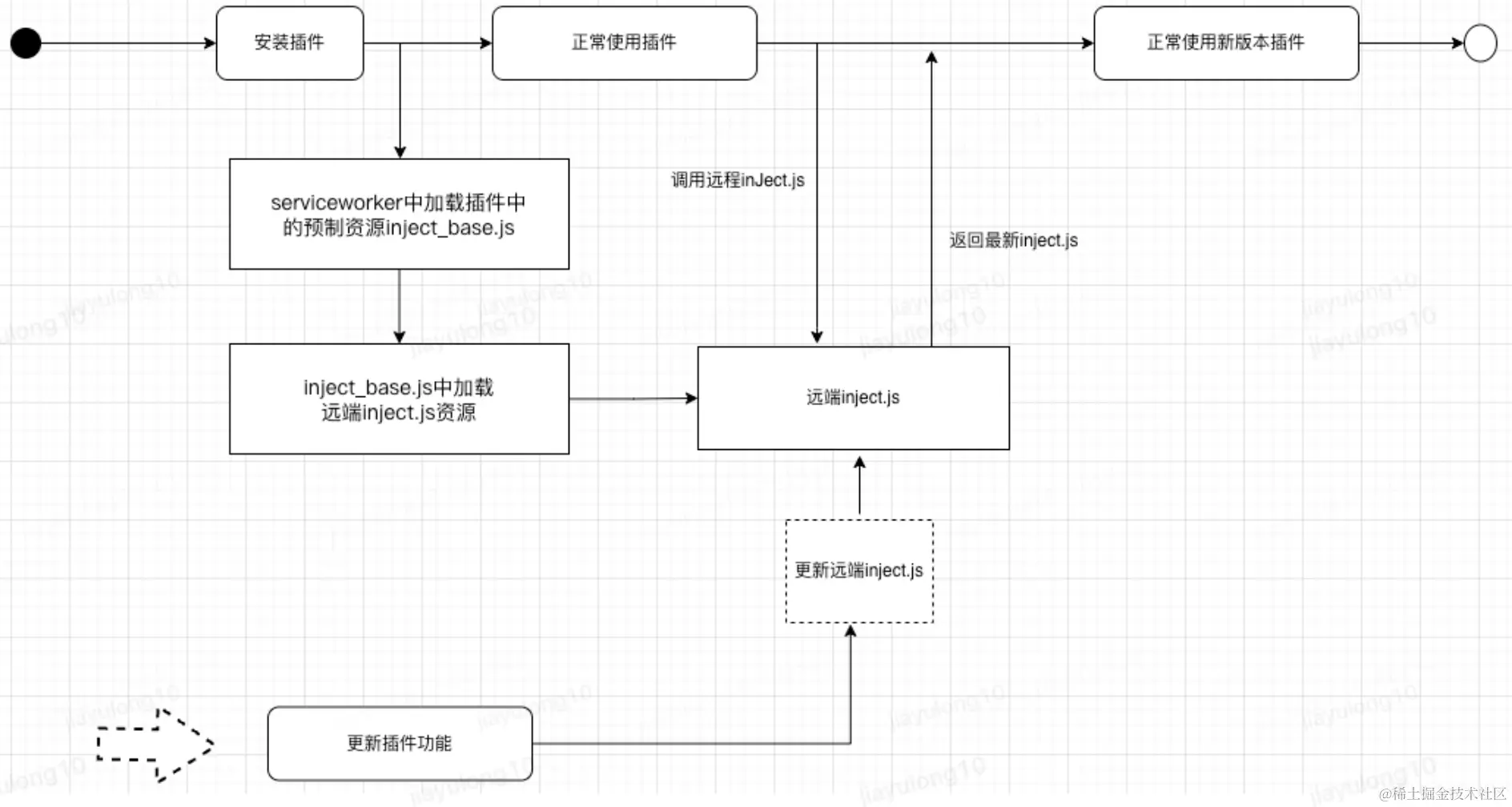2)再从inject_base.js中加载远端inject.js资源即可;当发布新功能时,直接发布远端的新版inject.js即可直接热更新插件功能。