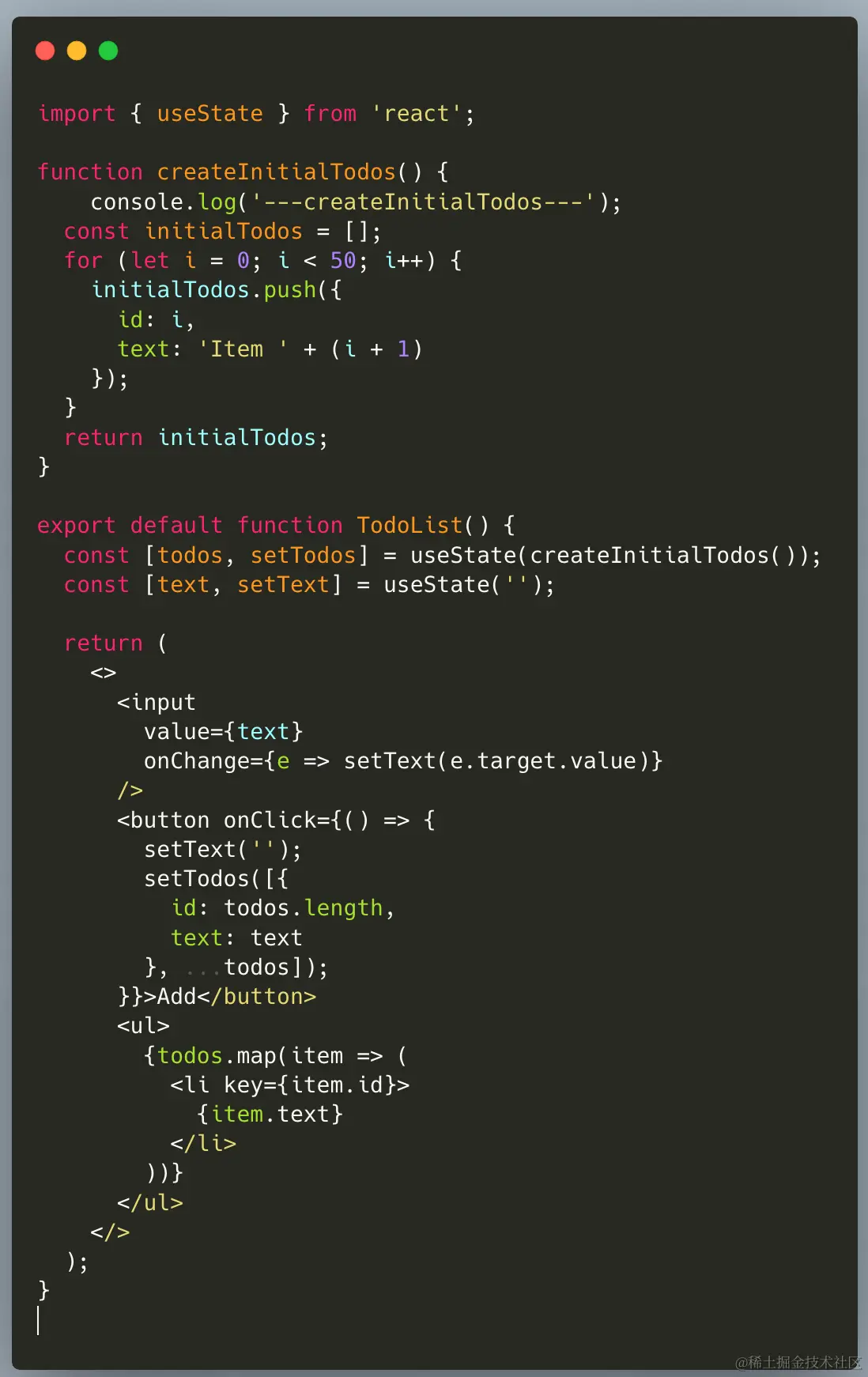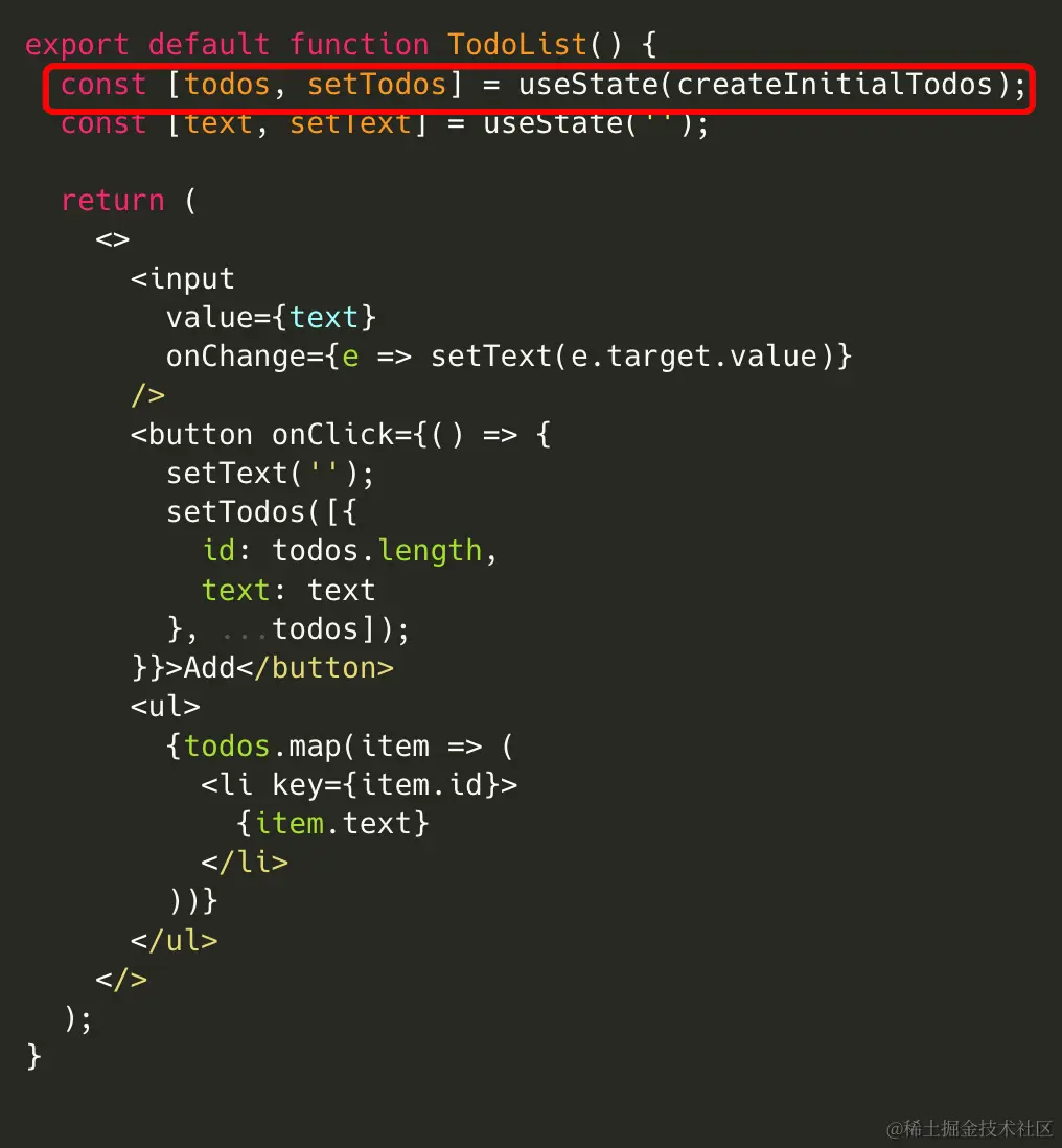 看下控制台,你会发现有个问题,每次todolist组件重新渲染的时候,createInitialTodos方法都会重新运行一次,但是,只有第一次的返回结果被useState使用,如果createInitialTodos在做非常耗时的计算的话,这就很消耗性能了