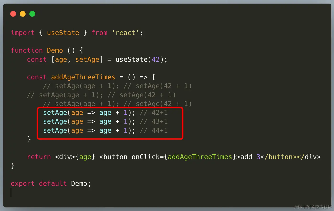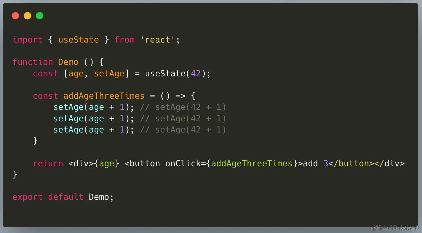 事实上,state这个东西你可以把它理解为一个快照(snapshot),你更新了它,但是它只会在下次render的时候才改变,也就是说你这样连着调用三次setAge(age+1),每次取得都是当前render中的快照,相当于每次都是setAge(42+1),所以,最终结果是43,并不是45
