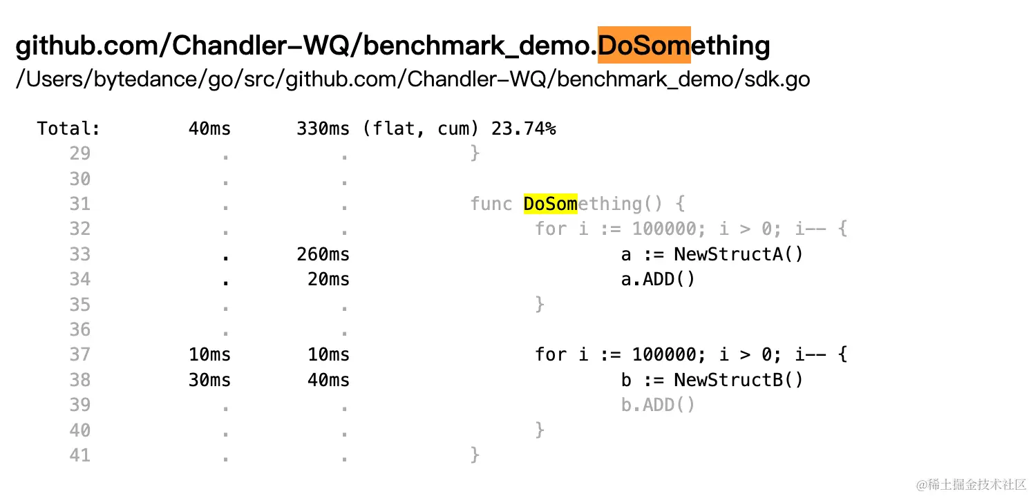 基于 source 和 flamegraph 两种视图可分析发现性能热点主要是 NewStructA,且NewStructA相较于 NewStructB 性能开销多很多,而NewStructA 和 NewStructB 不同点在于是否返回指针类型,基于下文[常见代码优化思路]分析返回指针会触发内存逃逸,需要优化。