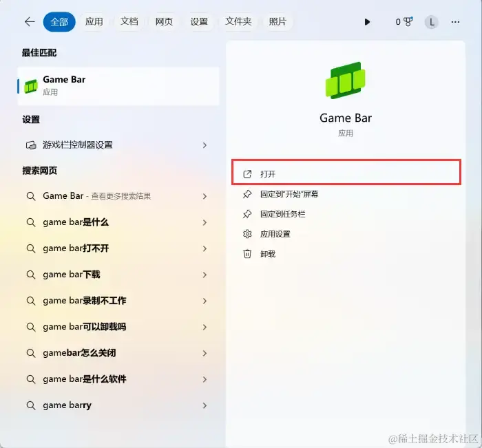 步骤1:第一次使用,需要通过电脑左下角 【设置】 > 【游戏】 > 【Game Bar】 开启该功能。