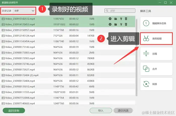 步骤4:录制完成后,文件会保存到此软件默认存放录屏文件的文件夹,您可以在 【历史记录】 中找到。点击进入 【高级剪辑】 可对您的游戏视频进行剪辑。