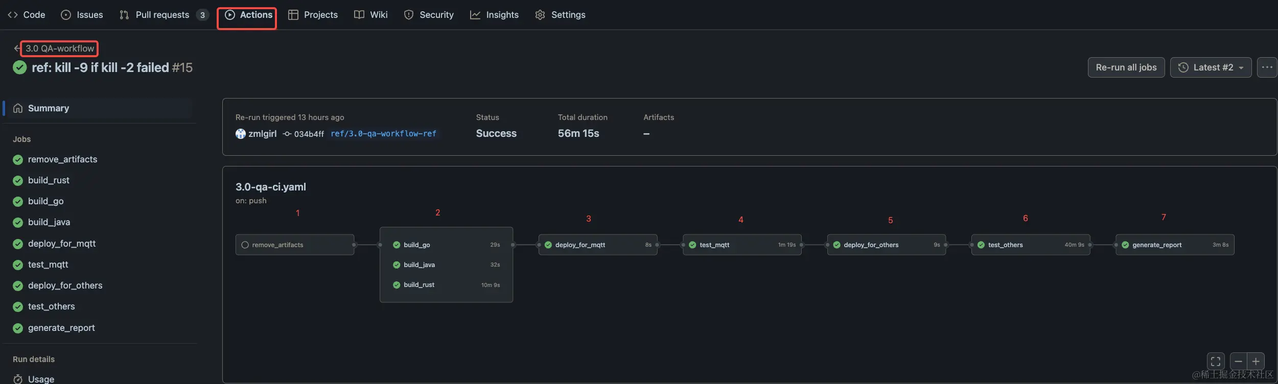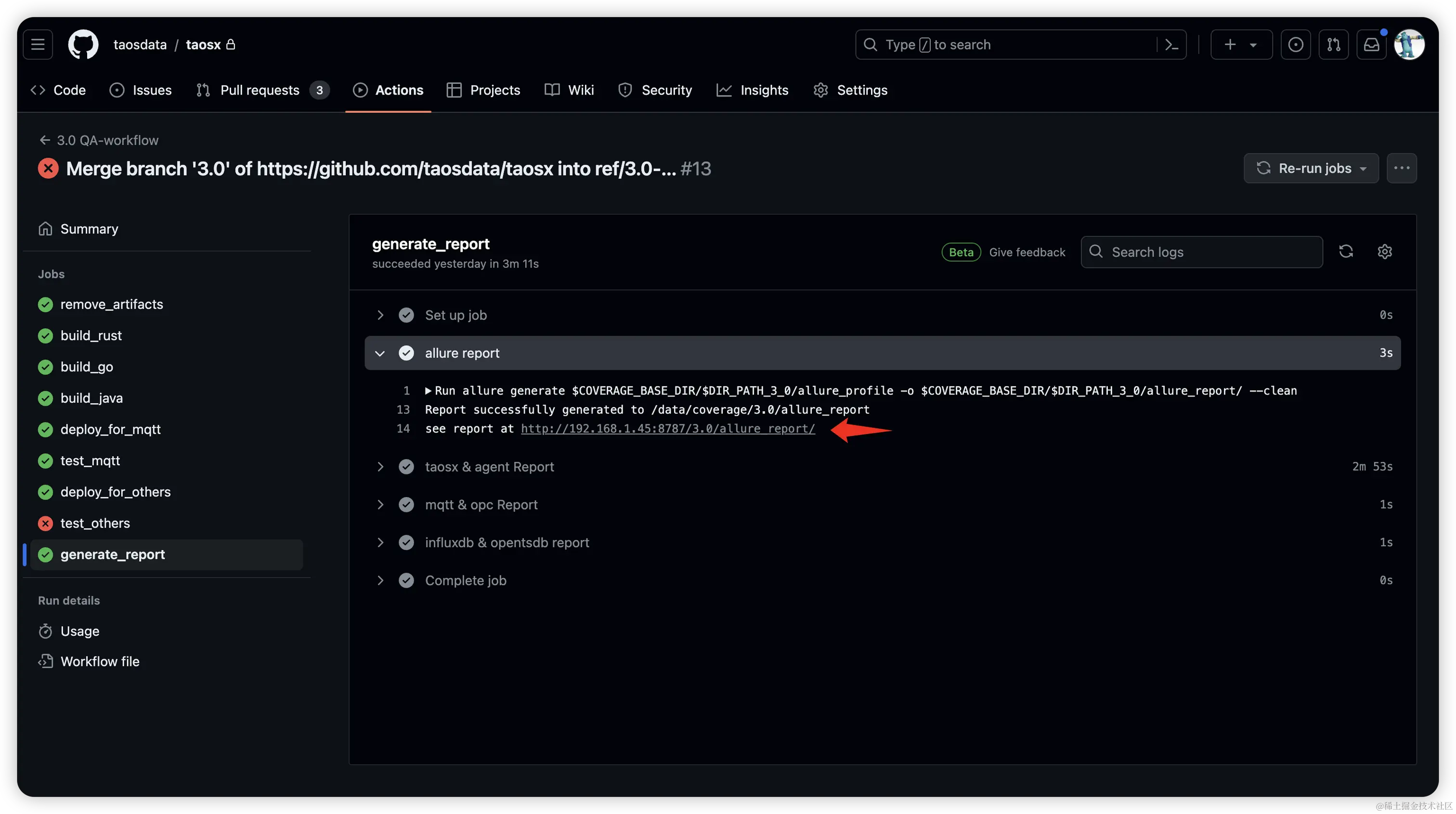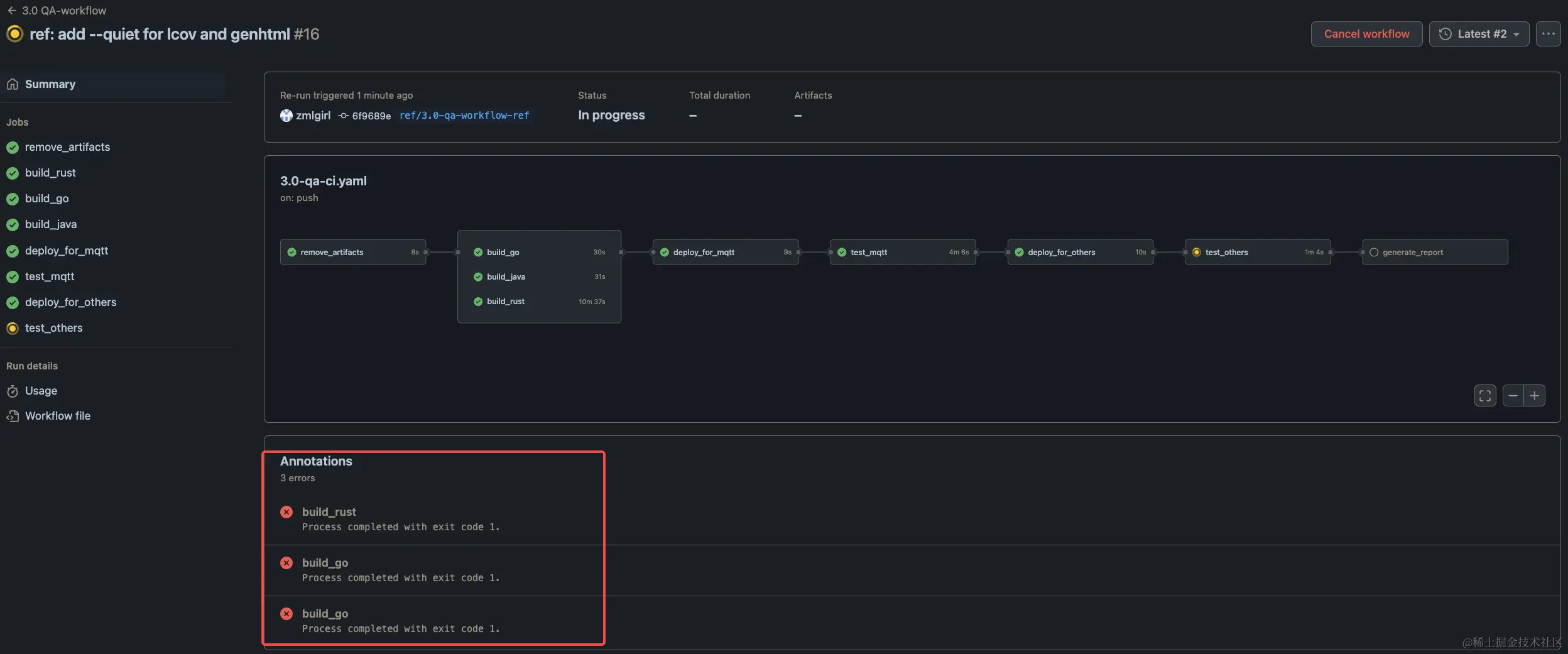 开发者在查看该 Action 的时候可以在底部看到流程中哪个 Job 的运行是出错了的。