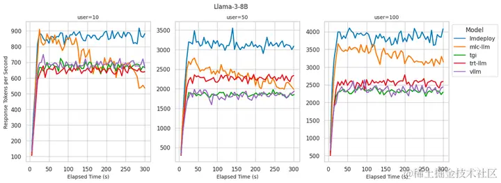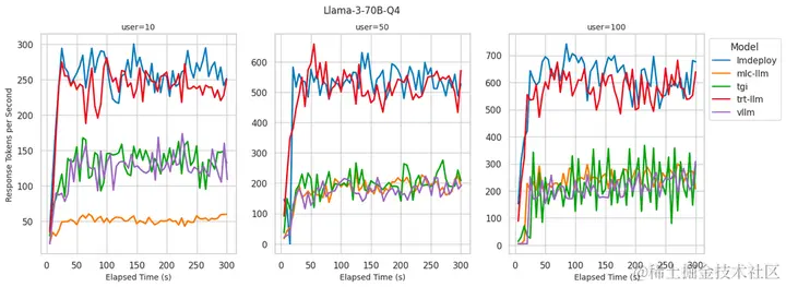 - LMDeploy: 在服务 100 个用户时提供了最佳的 token 生成率,达到每秒 700 token,同时在所有并发用户级别上保持最低的 TTFT。