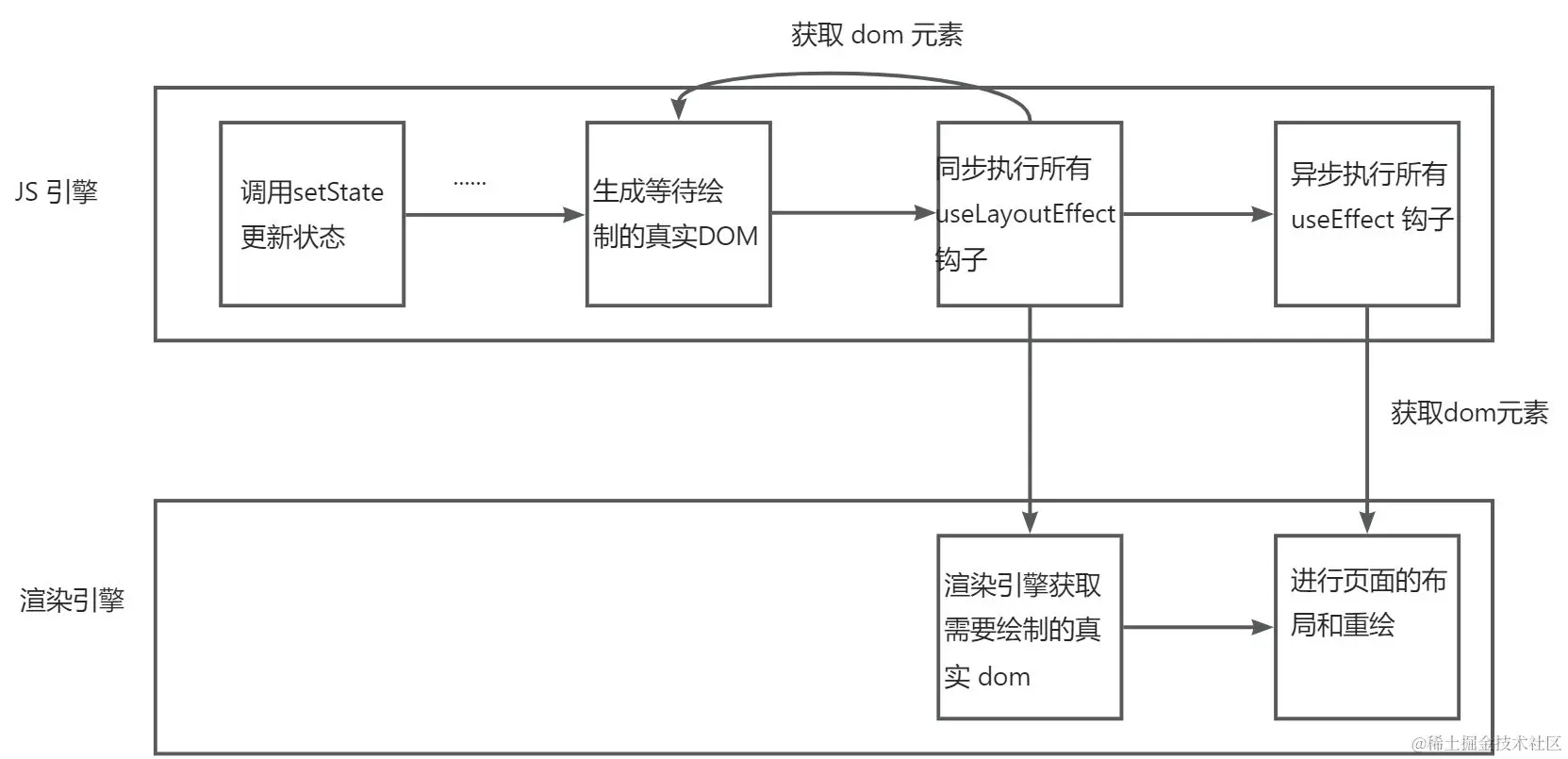 两种获取 dom 的处理方式,真实 dom 优先级大于已绘制的 dom,因此当 useLayoutEffect 中获取 dom 元素时,浏览器会将 js 引擎中生成的等待绘制的真实 dom 元素返回,此时的 dom 元素就是最新的元素。而在 useEffect 中获取的时候已经到了重新绘制的阶段,浏览器只能从正在绘制的页面上获取元素返回,虽然理论上将 useEffect 函数的执行和页面的绘制是同步进行的,但是实际上,JS 执行速度和页面绘制速度之间的差距可以是相当大的,所以即便两者是同时开始的,但是计算机内部执行速度来说,基本上绘制刚刚开始,useEffect 函数都已经执行完了,所以在 useEffect 回调函数中获取元素,几乎不可能获取到最新的元素。