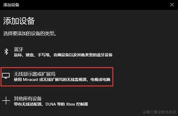 步骤4:在添加设备界面,点击**【无线显示器或拓展坞】**选项。