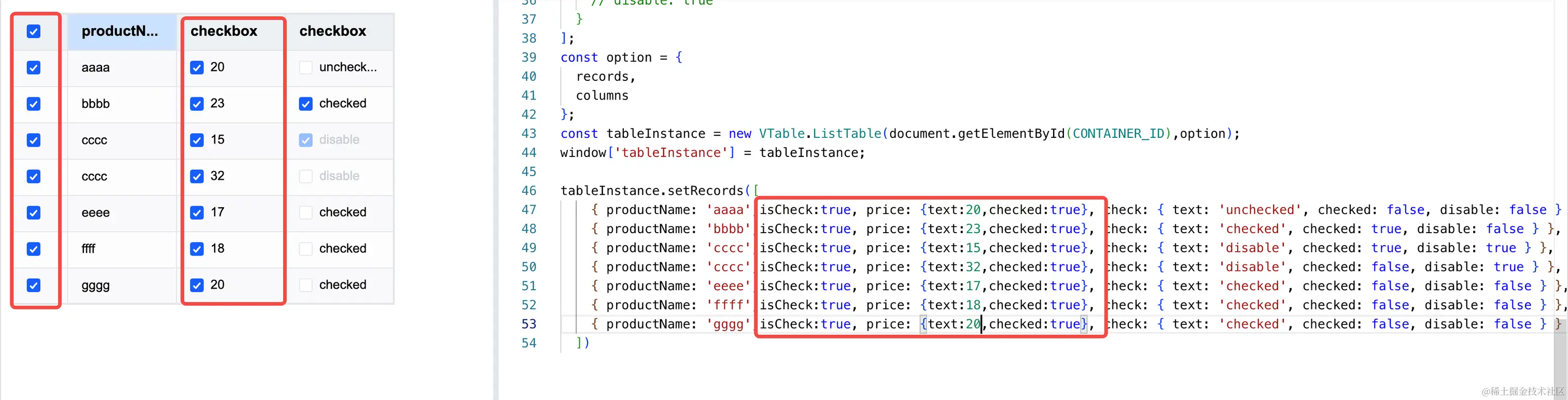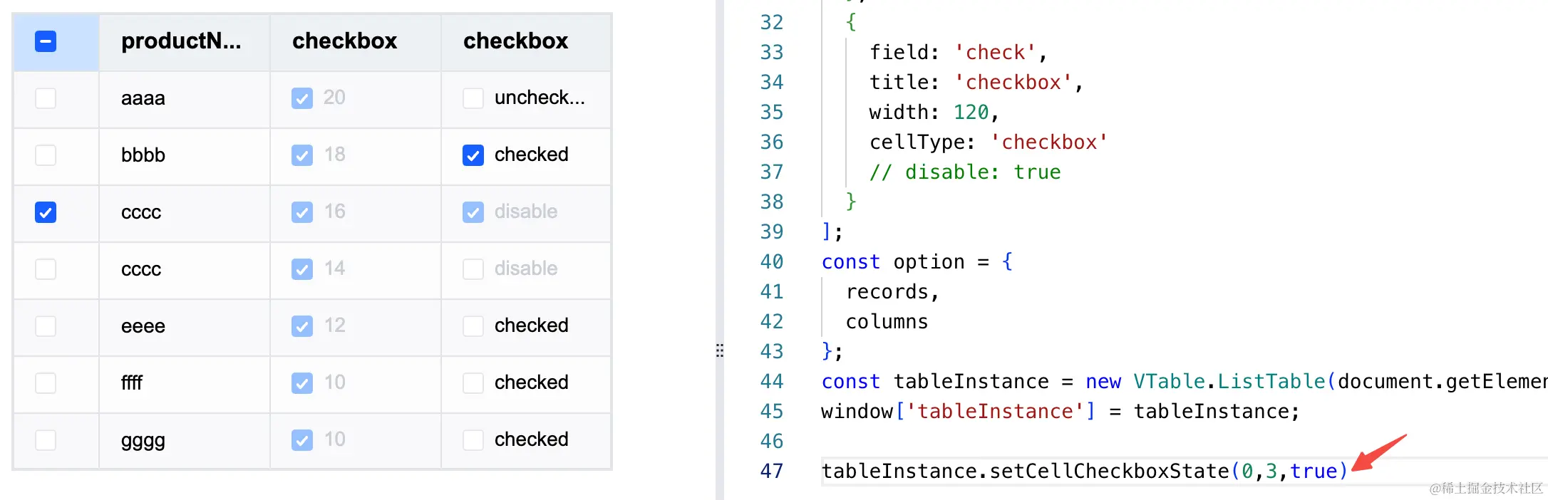 如 tableInstance. ``setCellCheckboxState(0,3,true) 即将位置为(0,3)的单元格的Checkbox状态设置为选中状态,官网demo修改后效果如下:visactor.io/vtable/demo…