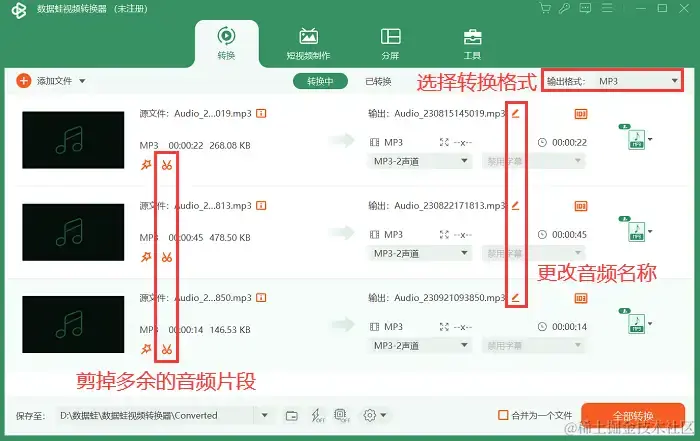 第2步:导入多个mp3音频文件后,对这些音频进行剪辑,把不要的片段去掉。还可以提前修改音频输出的名称,方便后续查找。点击**【输出格式】**按钮,进入下一步操作。