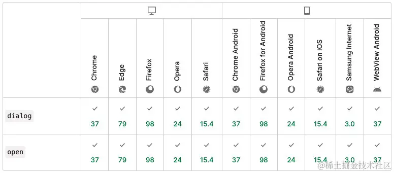 最新的浏览器都支持 dialog,如果遇到比如 Safari 15.4 浏览器以下的版本,可以使用谷歌官方的 dialog-polyfill。github.com/GoogleChrom…