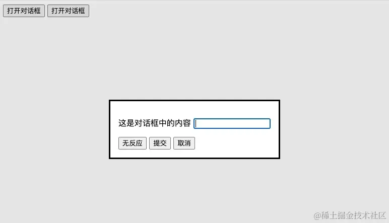 - 表单上的 method=dialog 属性,如果表单在dialog元素中,提交时就会触发关闭对话框,button 的 type 属性必须是 'submit'。当提交表单时,对话框的 returnValue 属性将会等于表单中被使用的提交按钮的 value。