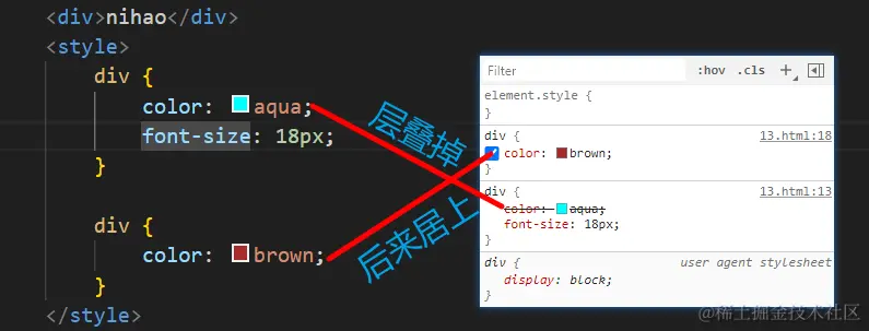 给同⼀个标签设置相同的样式 → 此时样式会层叠覆盖 → 会在最后的样式上⽣效