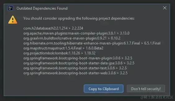 JetBrains的Lombok插件 3. Marc Walter的Maven依赖检查器插件 【插件链接】:plugins.jetbrains.com/plugin/1852… Maven依赖检查器插件在右击pom.xml文件时添加了一个新的“检查Maven依赖关系(Check Maven Dependencies)”选项。该功能会扫描你的依赖项,并在有新版本可用时发出警告。 请注意,这个插件只检查Maven Central。