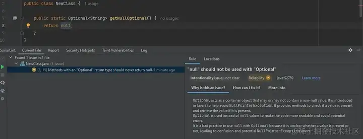 Rainbow Brackets示例。括号对被着色。 6. SonarSource的SonarLint插件 【插件链接】:plugins.jetbrains.com/plugin/7973… SonarLint实时扫描你的代码,并标记出所有可能存在的问题。它有许多不同的检查方法,这还不是全部:该插件会评估问题的风险,解释问题的原因,并告诉你如何解决、修复它,从而有效地教育你并提高你的技能。 它支持各种编程语言,并可以连接到SonarQube或SonarCloud,从而进一步增强其功能。 可以在这里查看SonarLint的文档。 【SonarLint文档】:docs.sonarsource.com/sonarlint/i…