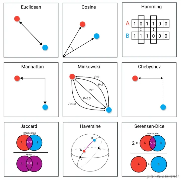 其他距离度量方式有,曼哈顿距离 (Manhattan Distance),切比雪夫距离 (Chebyshev Distance),闵可夫斯基距离 (Minkowski Distance)等
