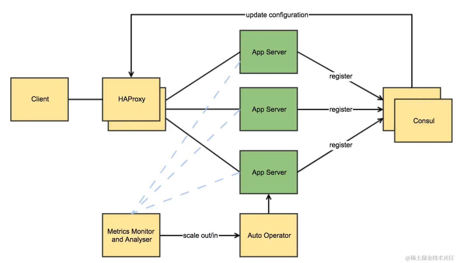 根据Monitor 和 Metrics 系统所得出的结果决定, 实时增加服务器, 注册到类似 Consul 的服务发现系统中, 利用它的服务发现和健康检查功能, 用 consul-template 来刷新更改 HAProxy, Nginx 这样的软件负载均衡系统的配置文件并重载 ( F5 , NetScalar 这样的硬件负载同理), 减少服务器也是一样的过程.