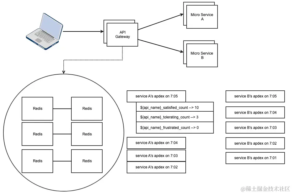 试举一例,我们有一个任务服务 task_service, 它有一个重要的 api 为 create_task, 我们可以通过 Redis 来记录当前时间段中这个服务的这个 API 的 APDEX 值